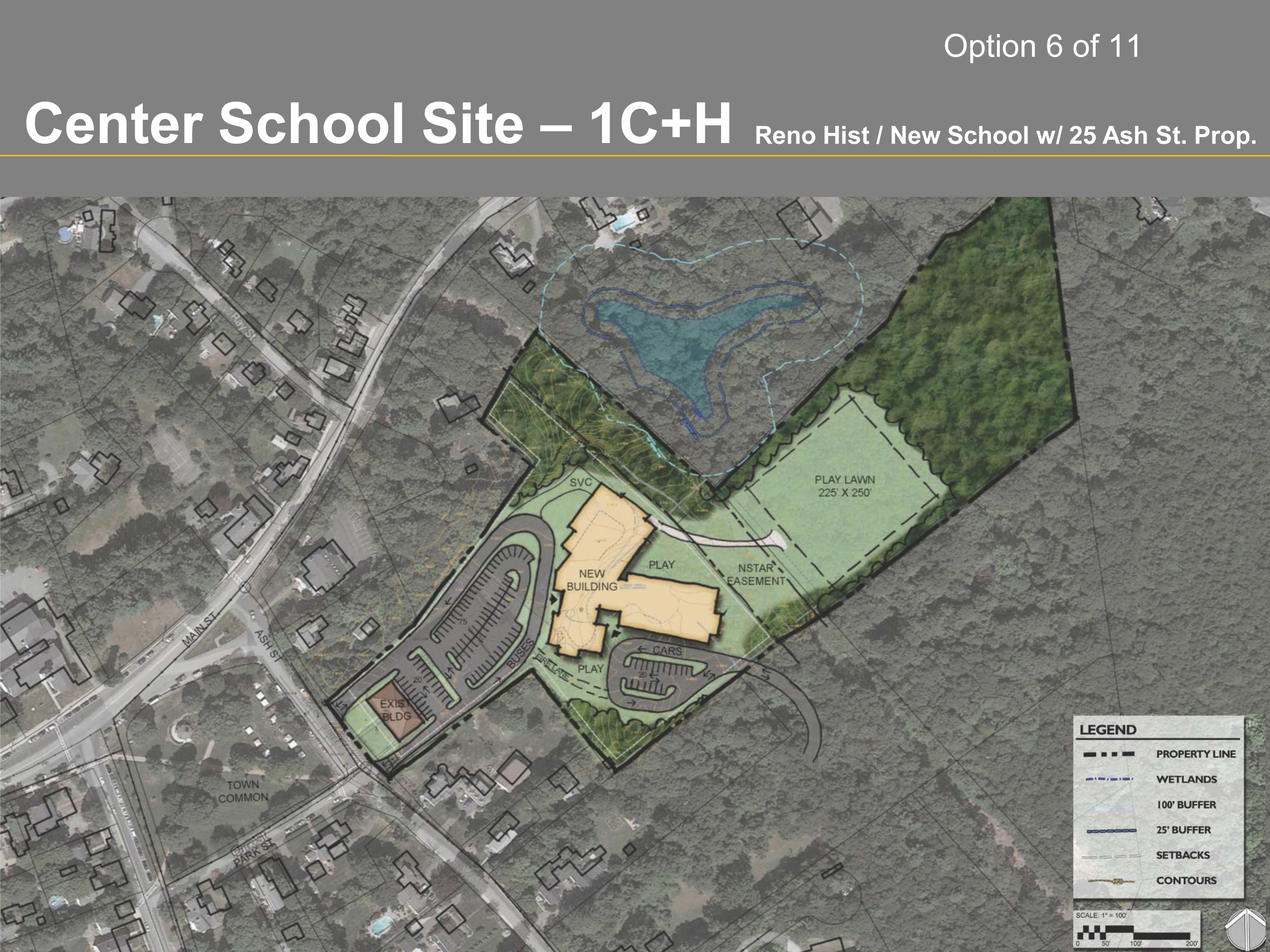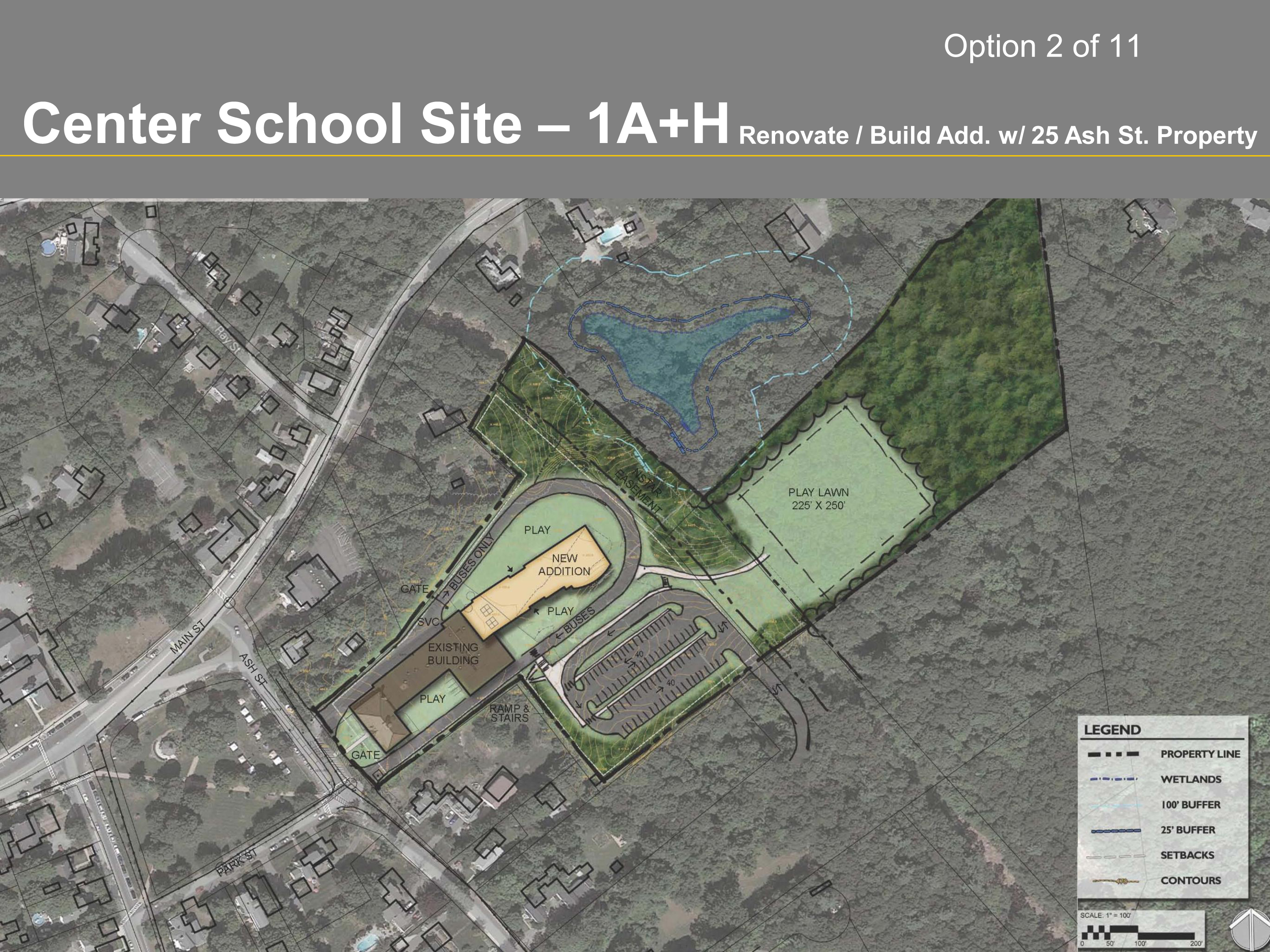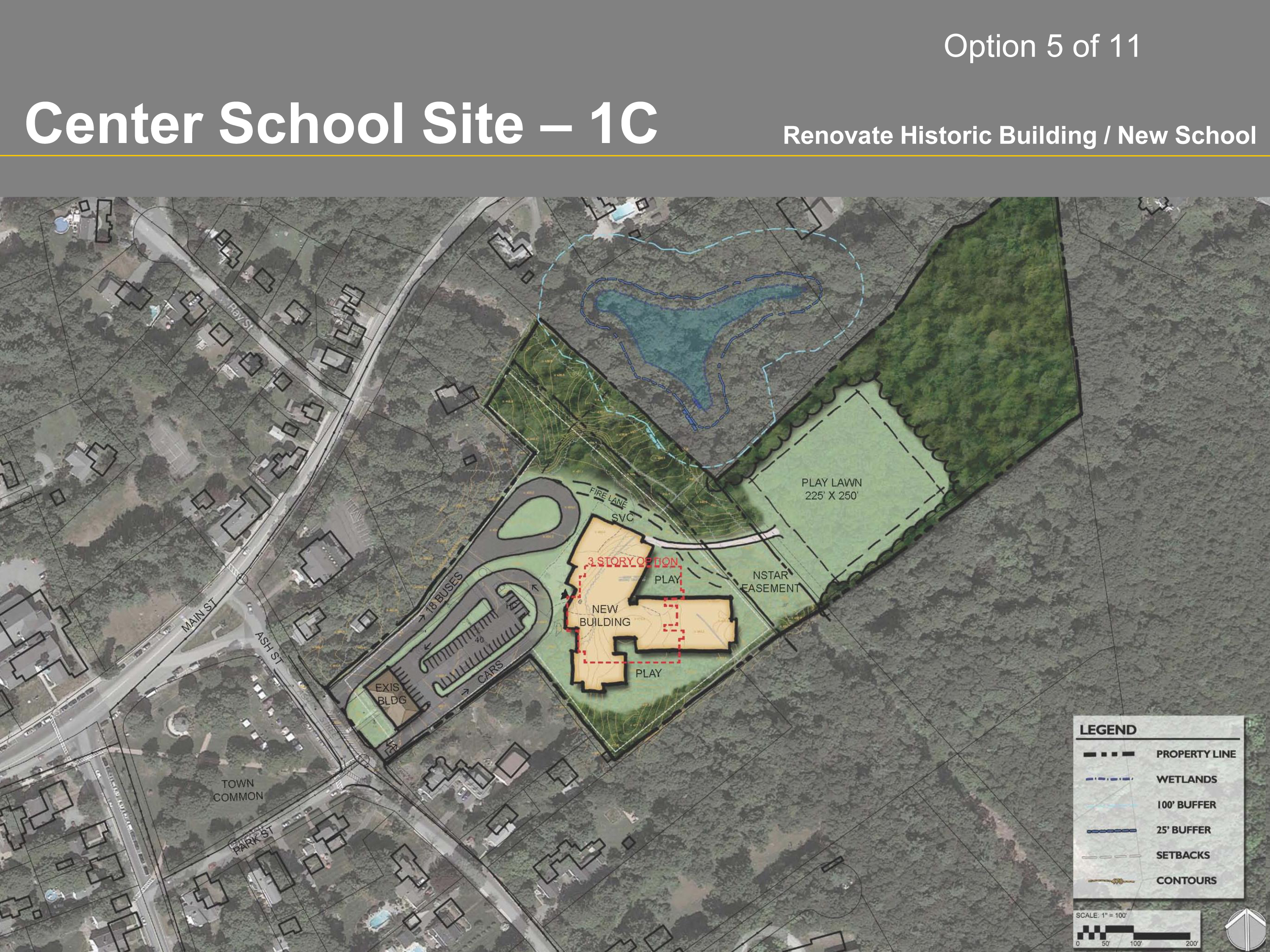 The slideshow below includes draft conceptual test fit depictions produced by the DRA design team. They were created to evaluate each site’s potential for a new or expanded Center School. There are currently 11 variations of school options (numbered 1 – 11) being considered at 4 different locations, including the potential for new land acquisitions. The preliminary concepts are subject to change and not reflective of final design.