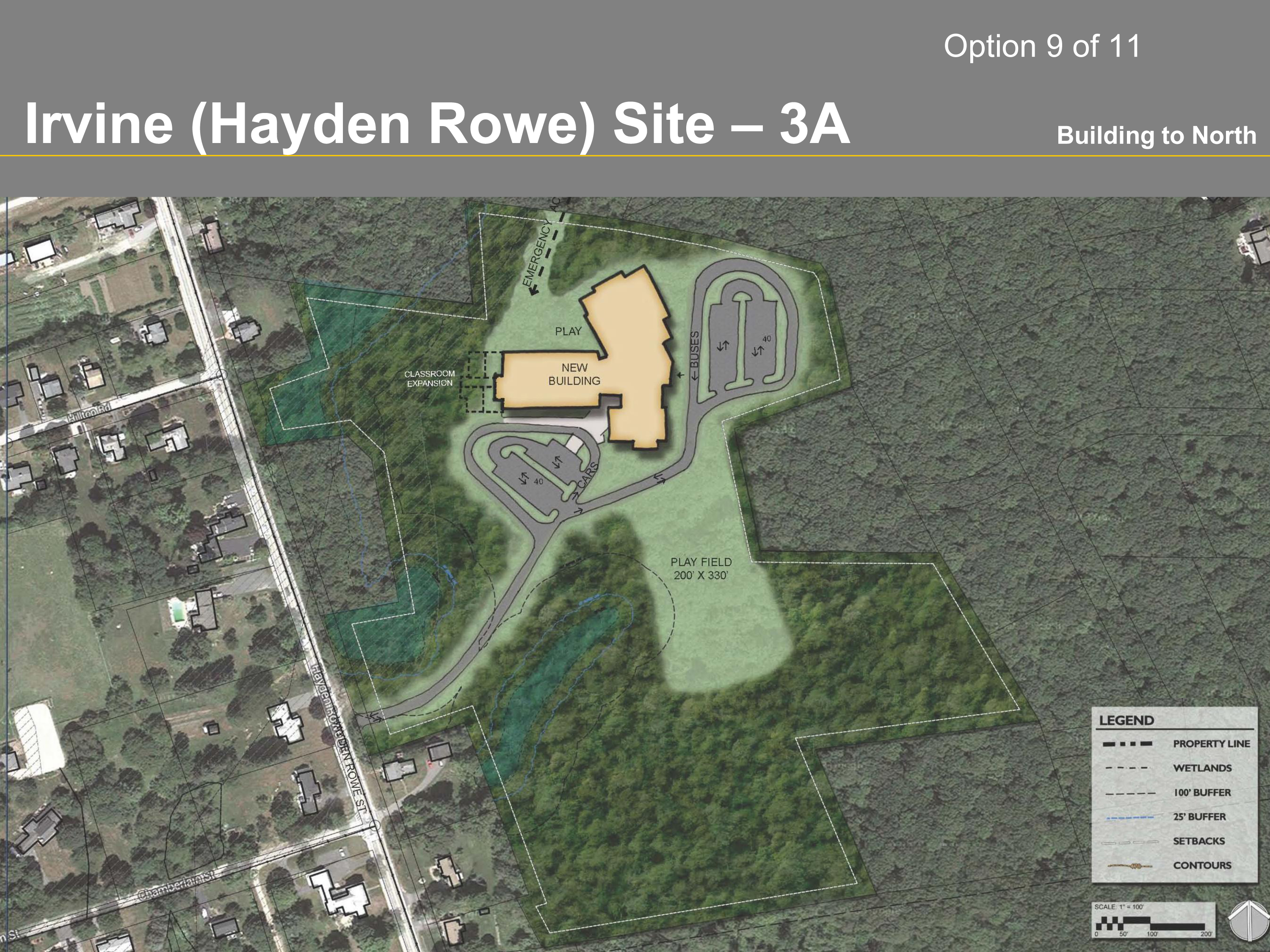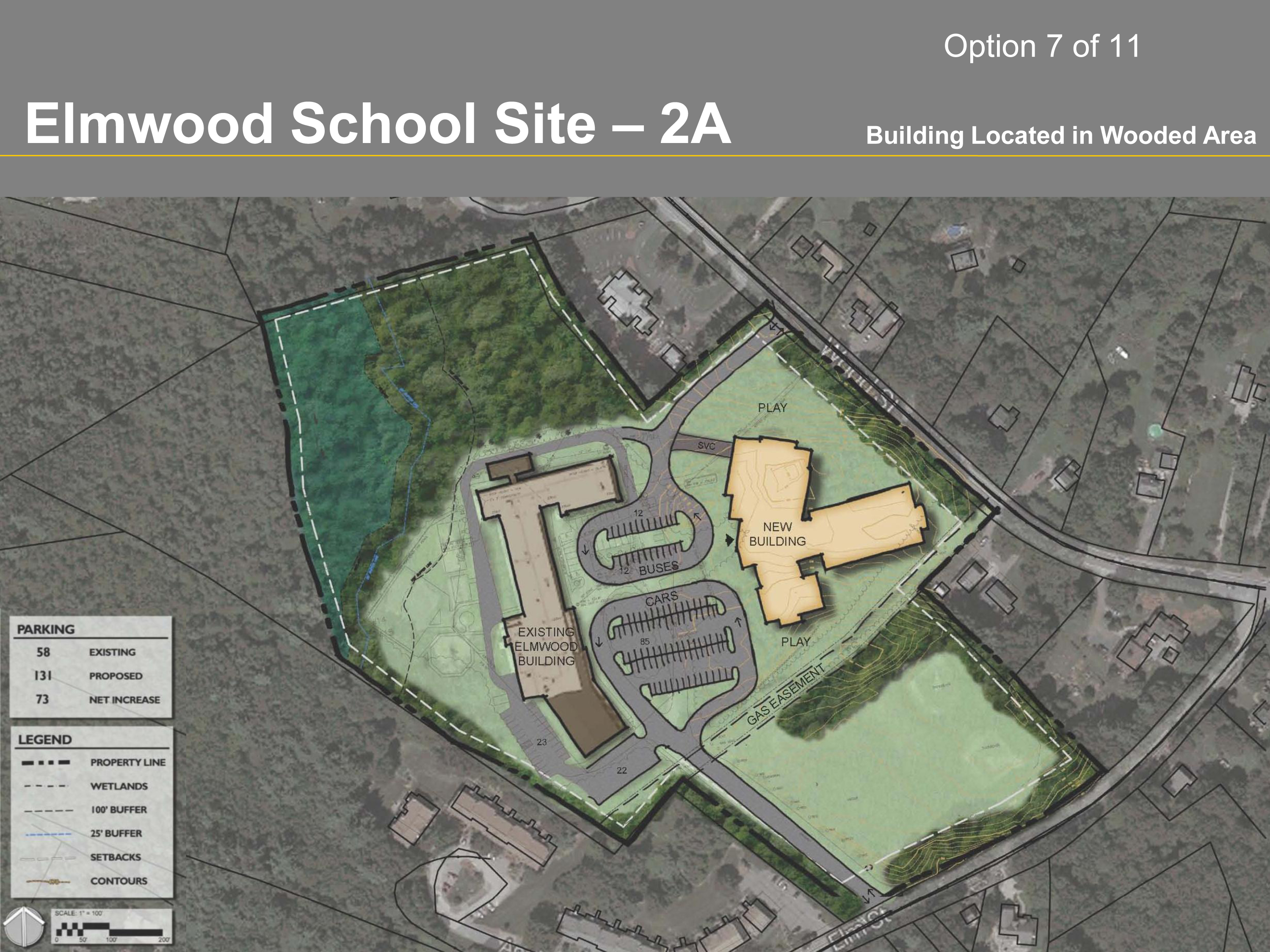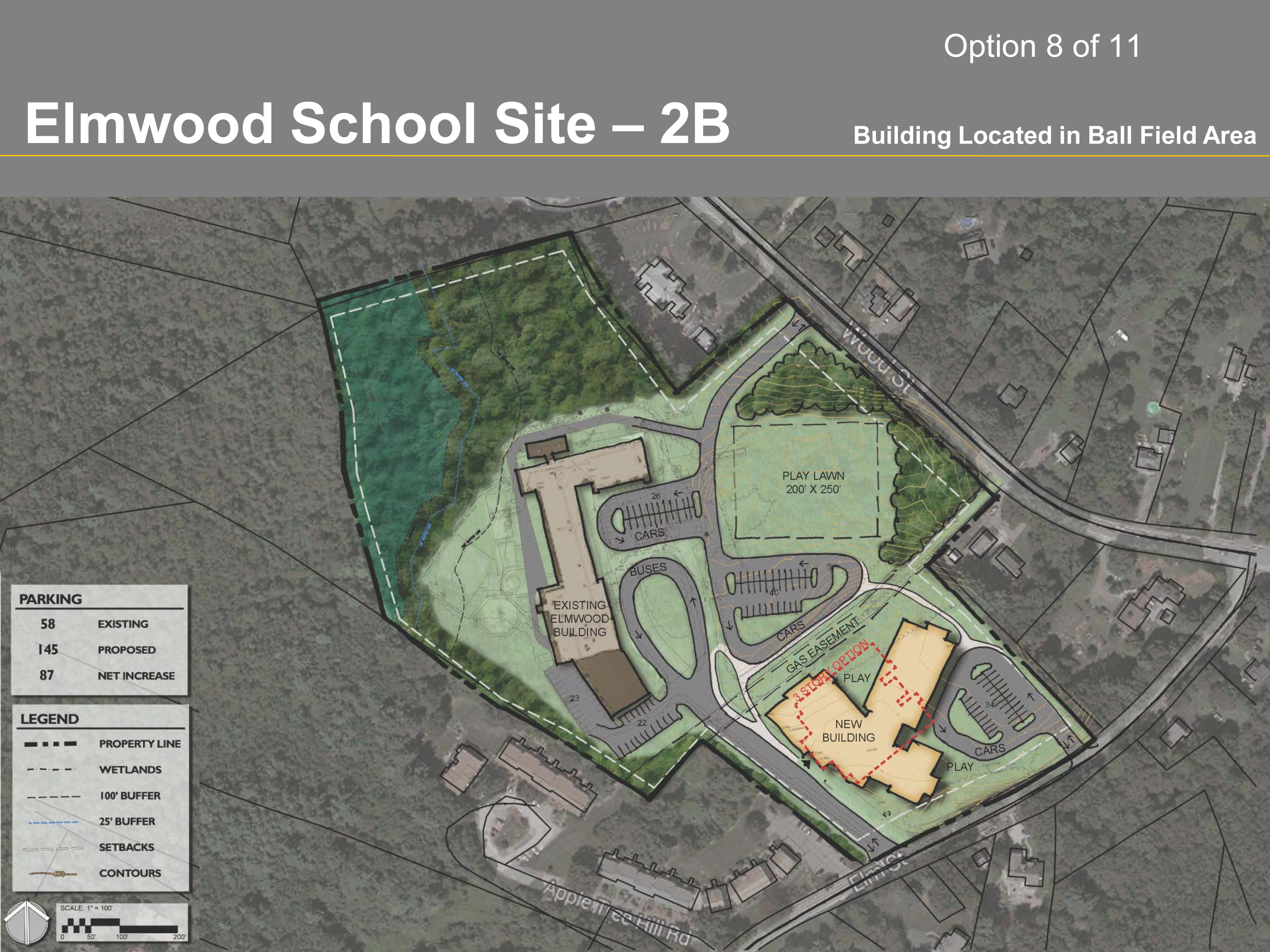 The slideshow below includes draft conceptual test fit depictions produced by the DRA design team. They were created to evaluate each site’s potential for a new or expanded Center School. There are currently 11 variations of school options (numbered 1 – 11) being considered at 4 different locations, including the potential for new land acquisitions. The preliminary concepts are subject to change and not reflective of final design.
