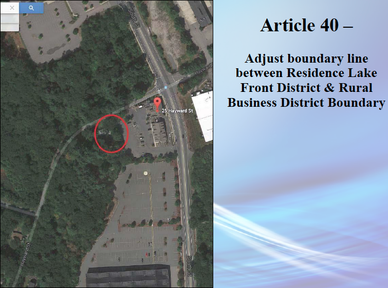 Article 40 – Adjust boundary line between Residence Lake Front District & Rural Business District Hayward Street – Citizen’s Petition by Property Owner, William C. Tetlow