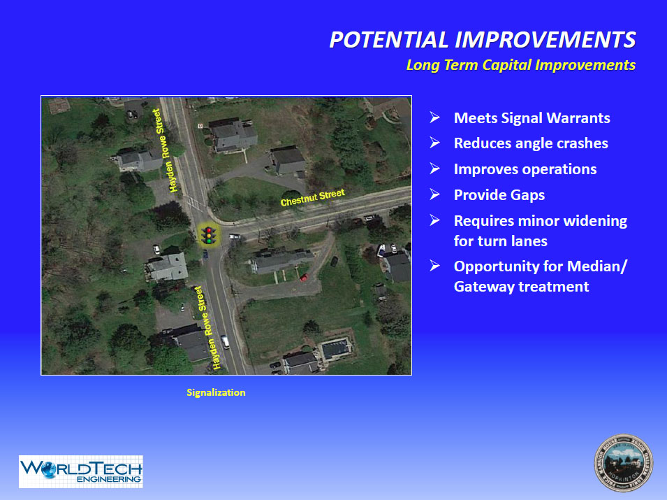 Traffic backups and safety hazards at the intersection of Chestnut Street and Hayden Rowe were discussed.   The consultants have found that the intersection meets the warrants set by the State for a traffic signal.  (The Manual on Uniform Traffic Control Devices  — MUTCD — is a document issued by the Federal Highway Administration of the United States Department of Transportation to specify the standards by which traffic signs, road surface markings, and signals are designed, installed, and used.  It specifies when towns can or can’t add a traffic signal, based on traffic volume, accident history, and a number of factors.)  According to the presenters, the state would allow a traffic signal at this intersection.  The presenters advised that a traffic signal would reduce angle crashes, improve operations, and provide gaps in traffic.  It was noted that adding a signal would help organize traffic rather than slow traffic.