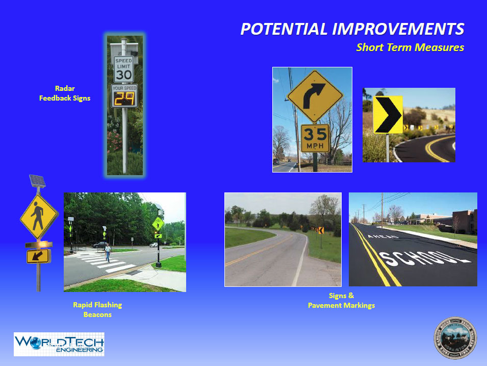 The presenters started with a description of various traffic calming measures to be considered. They explained that the state categorizes roads into four groups, 1) Major arterial (ex. Route 9), 2) Minor Arterial (ex. Hayden Rowe), 3) Major Collector (ex. Pleasant Street), 4) Neighborhood Collector (ex. Theresa Road) which determines the types of traffic calming measures that are allowed by the Mass Department of Transportation. As a Minor Arterial Road, the state would allow the following traffic calming measures on Hayden Rowe: Roundabouts, curb extensions, parking bays, chicanes (an artificial narrowing or turn on a road), raised median, pavement surface modification, and landscaped roadway (see images in slides for examples). Examples of short term solutions include permanent radar feedback signs, rapid flashing beacons at crosswalks, as well as additional signs and pavement markings. The state does not allow other traffic calming measures such as raised crosswalks and speed humps on a Minor Arterial Road like Hayden Rowe. The town will consider traffic calming measures within these rules and regulations set by the state.
